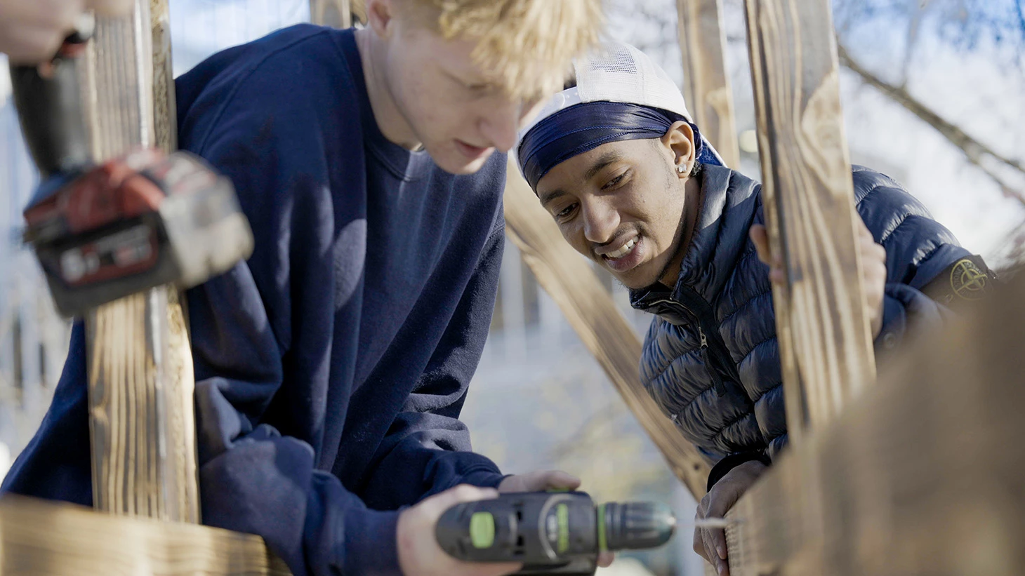 - Vi er jo i gang med at bygge en fredagsbar. Det, synes vi, er megafedt. I stedet for at stå i skolen og lave de samme ting eller bare lige prøve en lille ting af, så er det her mere spændende. At komme ud og lave noget for nogen, som bliver brugt. Selvfølgelig så laver vi det også til perfektion. Vi er jo ikke på skolens område længere. Vi er jo ude og lave ting for folk, som kommer til at blive brugt. Så det er virkelig fedt at kunne lave noget for folk, siger en elev.